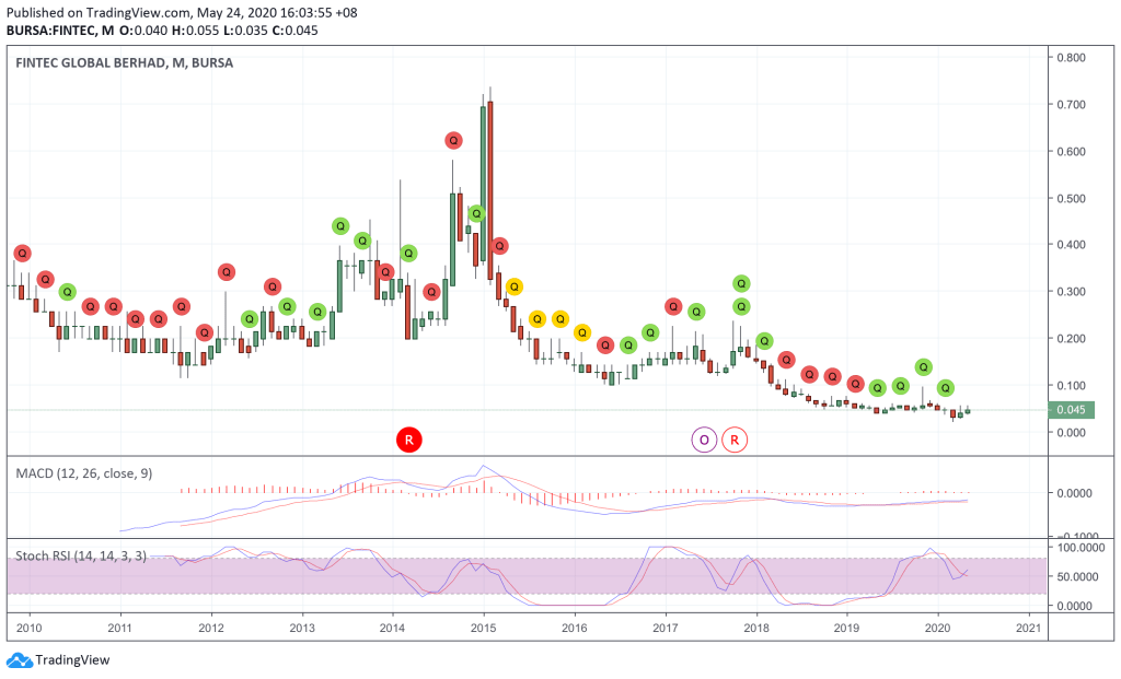 It is important to note that Fintec owns 25.188% or about 515 million shares of Focus Dynamics Group Berhad as of 3-Feb-2020, which is a company valued by the market at RM1.44 billion as of 22 May 2020. Based on the +36% gain in Focus Dynamics share price in Q12020, the soon to be released quarterly result is expected to be substantially contributed by this gain caused by marked to market valuation of its shareholdings of Focus Dynamics. But how about the rest of the year? They will depend a lot on the share price performance of Focus Dynamics.